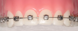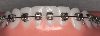 1) Konventionelle Brackets, bei welchen man den Bogen mit Hilfe eines Gummis im Bracketschlitz befestigt. Durch dieses „Hineindrücken“ erhöht sich allerdings der Widerstand, den der Zahn einer Bewegung am Bogen entlang entgegensetzt. Daraus ergibt sich oft eine längere Behandlungszeit.